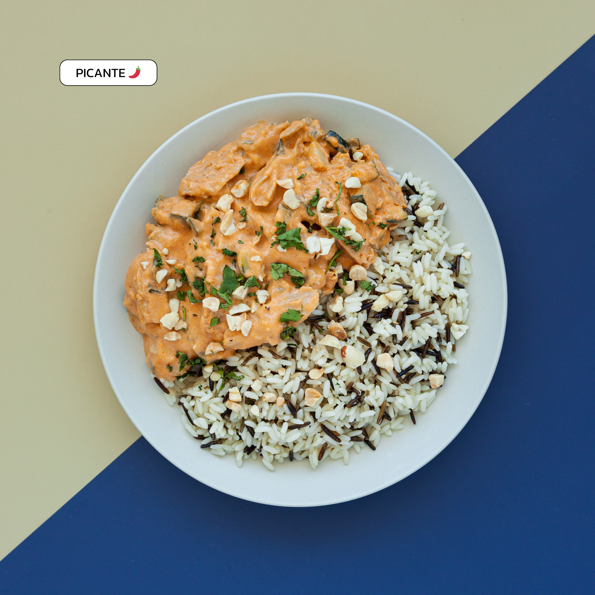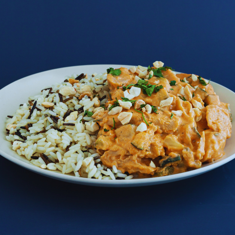 "Vrango" in Thai Red Curry sauce (Red Curry Paste, coconut milk, sesame oil, coriander, lemon and pepper) and zucchini. Accompanied by Wild Rice. It has the best of both worlds: the savory, healthy nature of an Asian dish and the satisfying crunch of "vrango." Take a bite, and you will be transported to a tropical beach.