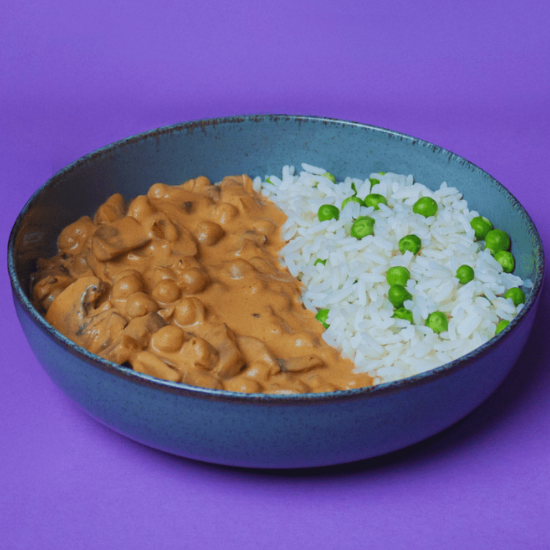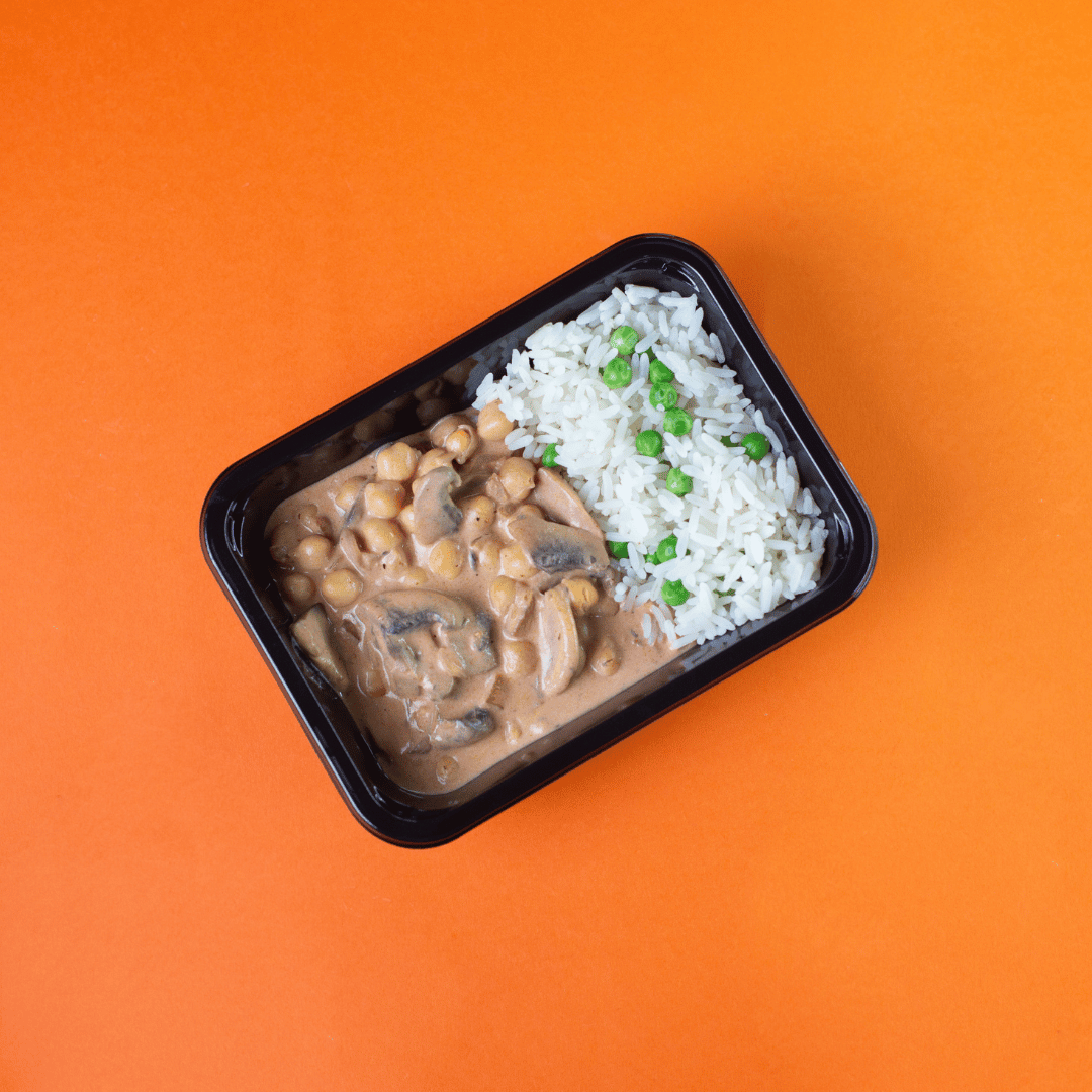 Our Stroganoff is a mixture of white mushrooms, chickpeas - tossed gently in a creamy sauce based on ketchup, mustard, accompanied by rice and potato sticks.