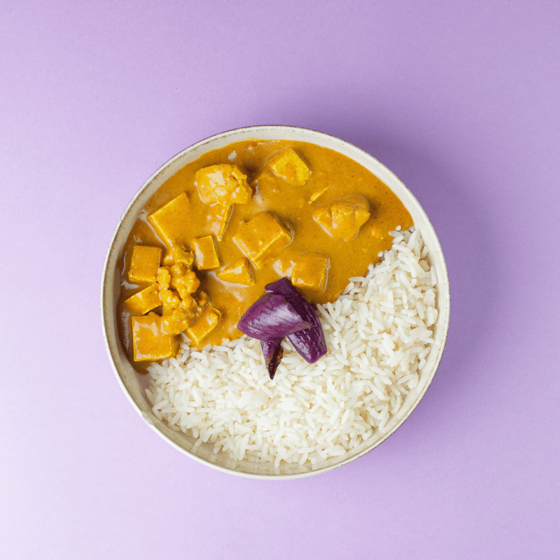 Our Tofu Tikka Masala will transport you to the streets of India with its rich and complex flavors. Tofu and cauliflower are cooked in a delicious red sauce made with coconut milk and Indian spices and served with basmati rice and peas. It is the perfect dish for those looking for an exotic and tasty meal.