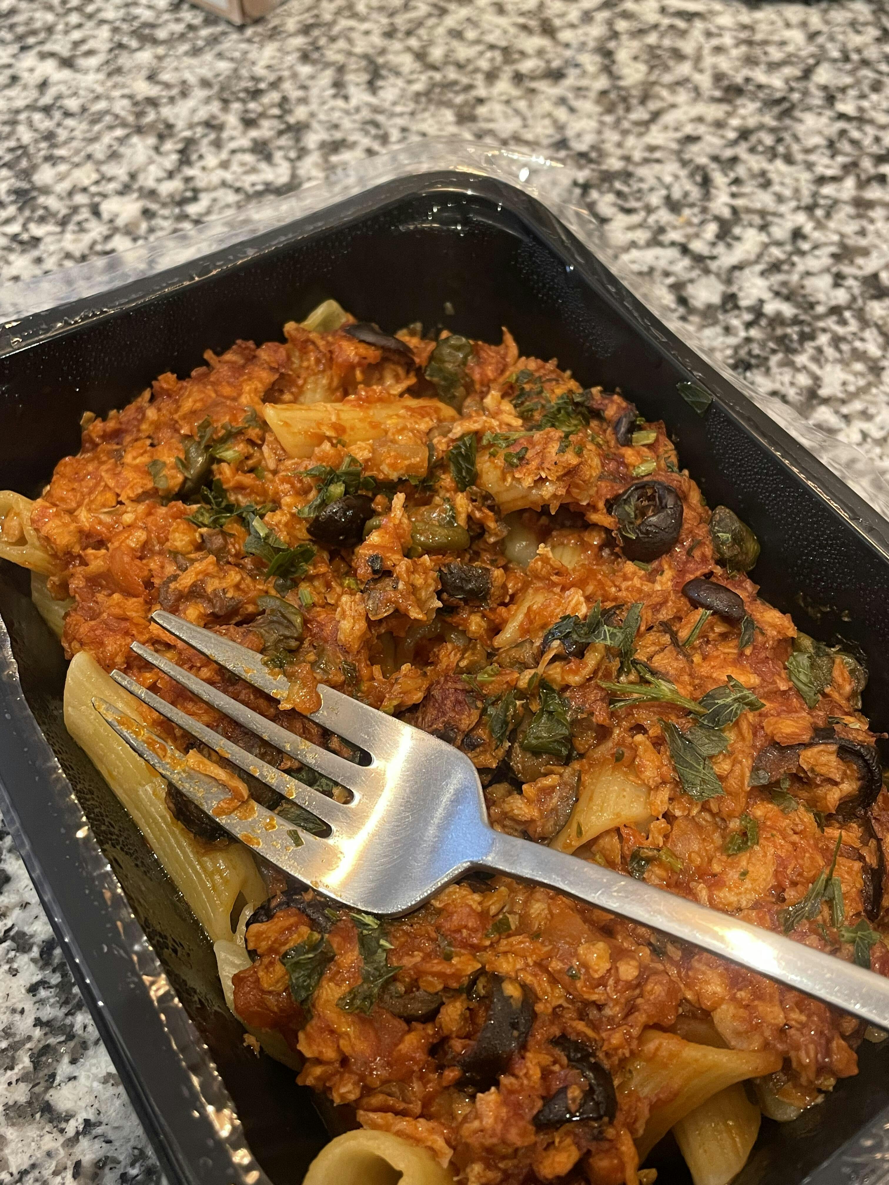 Ingredientes: Massa penne, polpa de tomate, atvm do futuro (Mistura de proteínas vegetais: 17% proteína de soja concentrada, 1% concentrado de proteína de ervilha, 1% farinha de grão-de-bico), azeite, aromatizantes naturais, sal, rabanete em pó, óleo de microalgas com Schizochytrium sp DHA, açúcar, cebola, ácido ascórbico), vinho branco, cebola, azeitonas pretas, alcaparras, azeite extra virgem, salsa, sal iodado, alho e pimenta preta. Contém glúten e soja.